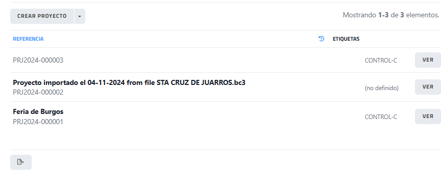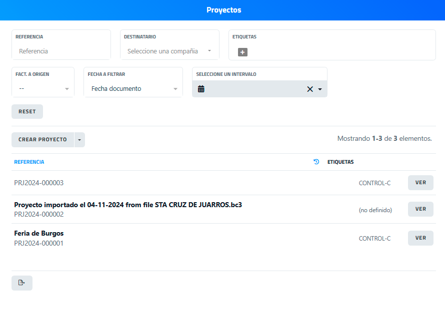 | Listado de proyectos | Tabla donde se muestran los proyectos existentes con su referencia, descripción y etiquetas asociadas. |