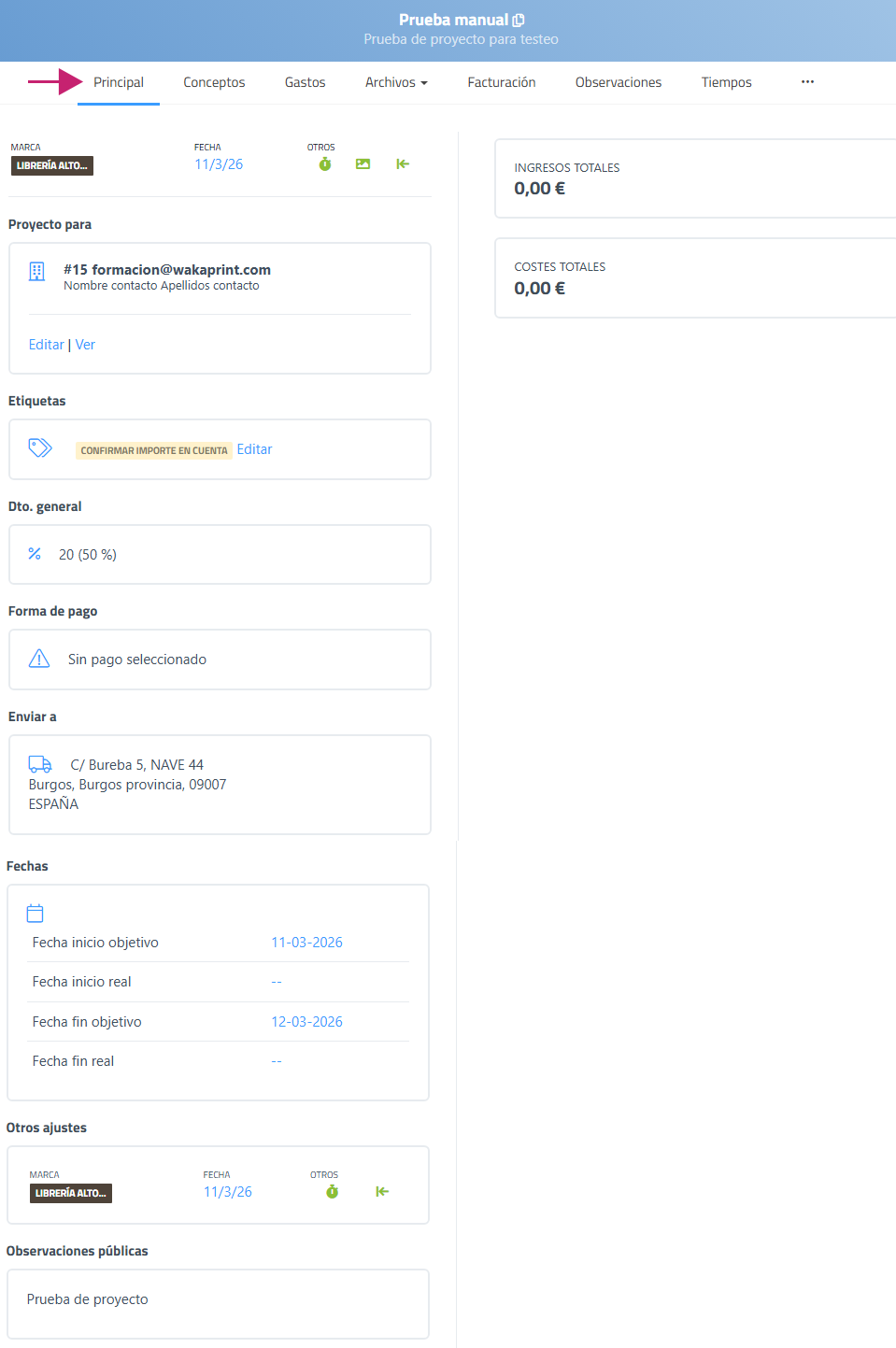 La pestaña “Principal” muestra la información general del proyecto y permite consultar y modificar sus datos más relevantes. Desde esta interfaz se visualizan los datos básicos del proyecto, como el destinatario, etiquetas, descuentos, forma de pago, dirección de envío y fechas previstas o reales del proyecto.