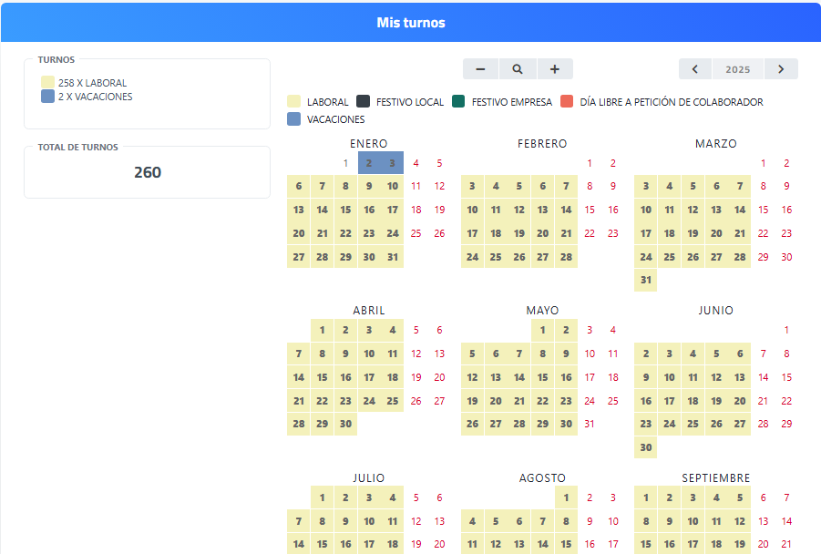 El sistema genera automáticamente un resumen de turnos, facilitando el seguimiento de la planificación anual.