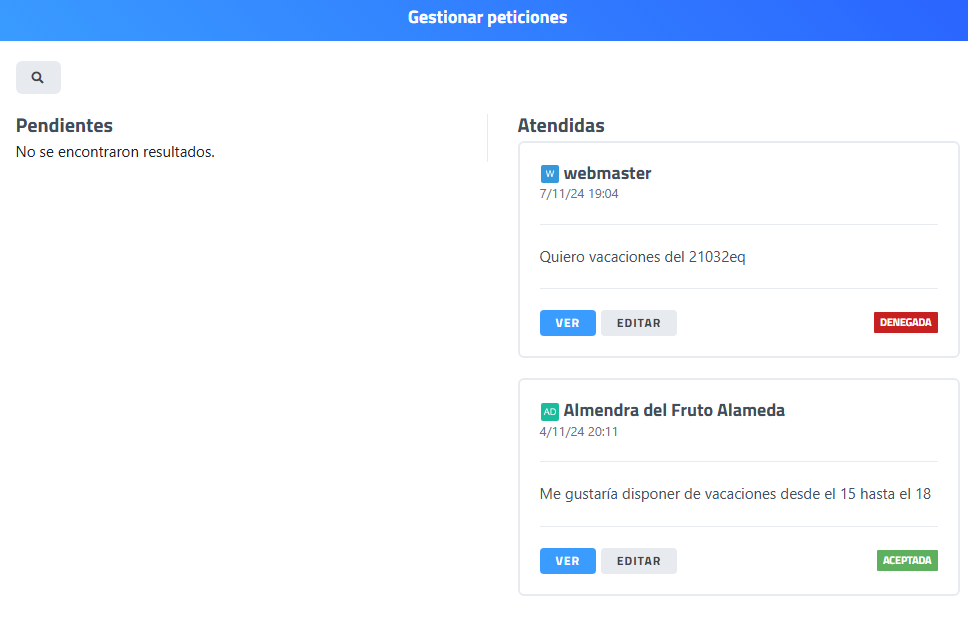 El módulo de peticiones permite a los empleados enviar solicitudes internas a través de ENICO, facilitando una comunicación estructurada entre empleados y responsables.