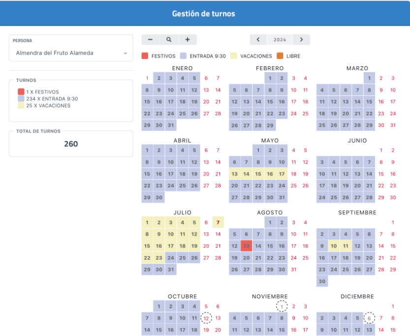 Identifica los distintos tipos de turnos mediante colores (festivos, horario de entrada, vacaciones o día libre). |