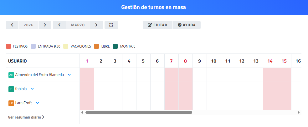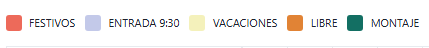 Muestra los distintos tipos de turnos disponibles, identificados mediante colores (festivos, entrada, vacaciones, libre, montaje, etc.). |