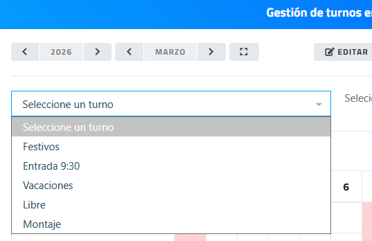 Activa el modo de edición para realizar cambios en los turnos de los empleados. Al hacer clic en este botón se despliega un selector de los tipos de turnos. Seleccionar el que se quiera planificar. |