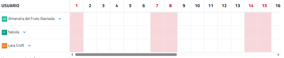 Indican el tipo de turno asignado a cada usuario en un día concreto mediante un color. En la imagen de ejemplo para reflejar las vacaciones de un trabajador. El resto de filas pertenecen a los turnos sin definir del resto de usuarios con permiso para ver sus turnos.