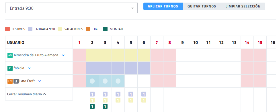 - Finalmente, al pulsar el botón "APLICAR TURNOS", se asignará el turno seleccionado a los días que se han marcado en el calendario y a los usuarios de las casillas de días seleccionados. La gestión masiva de turnos permite al administrador “pintar” el calendario de cada persona de forma rápida y visual.