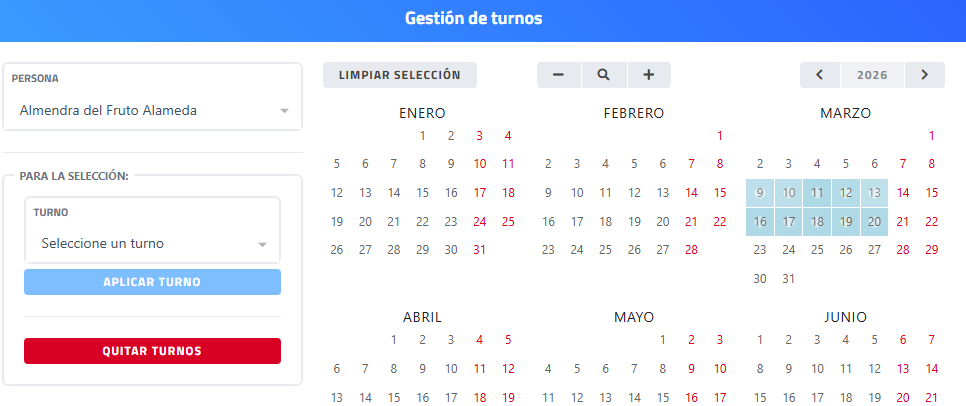 - Pulsar el botón "Aplicar Turno", para que se asigna el turno seleccionado a los días que se han marcado en el calendario, permitiendo al administrador “pintar” el calendario de cada persona de forma rápida y visual.