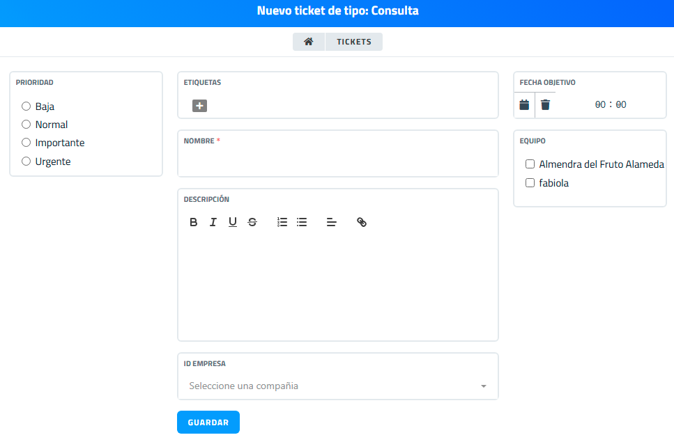 Una vez seleccionado el tipo de ticket, se abrirá una nueva ventana con el formulario de creación de ticket. Este formulario permite definir múltiples atributos del ticket para facilitar su gestión posterior. A continuación, se explican las opciones disponibles en el formulario: