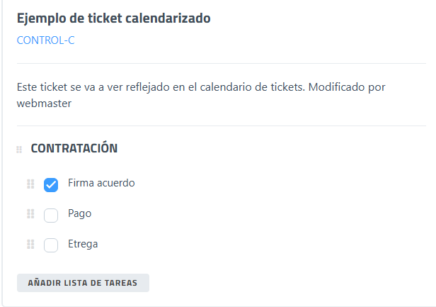 Permite dividir el ticket en subtareas y marcar su progreso. Se pueden crear tantas listas y elementos como se necesiten.