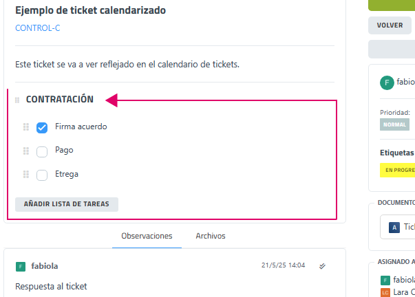Permite dividir el ticket en subtareas y marcar su progreso.