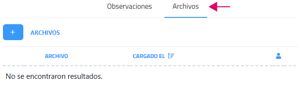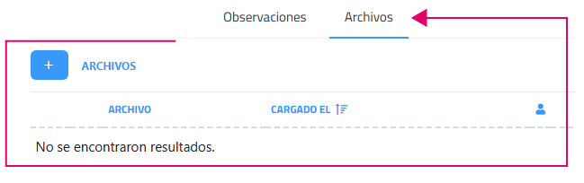 Junto a la pestaña de "Observaciones", cada ticket cuenta con una pestaña denominada "Archivos". Esta sección permite adjuntar archivos directamente al ticket, facilitando el intercambio de información adicional relevante para la gestión y resolución de la solicitud. Desde esta sección se pueden añadir nuevos archivos y descargar los que se han subido.