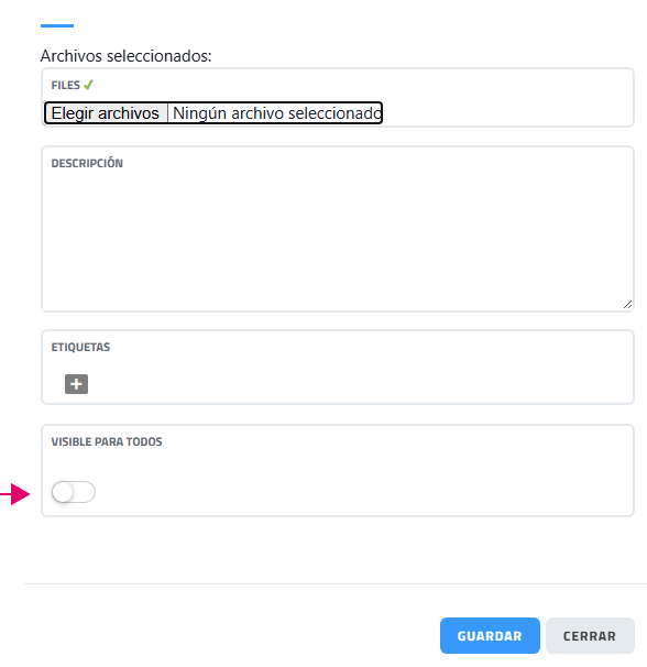 2.4 Botón para activar "Visible para todos". Permite al cliente tener acceso a este ticket para ver solo los archivos marcados como "Visible para todos". Para que se aplique se marca antes de subir el o los archivos y antes de hacer clic en botón "GUARDAR".