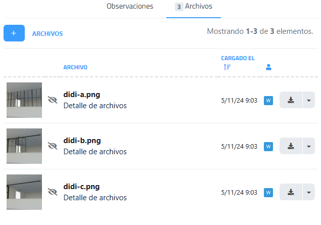 Muestra el número de archivos visualizados (ej. “Mostrando 1-3 de 3 elementos”). |