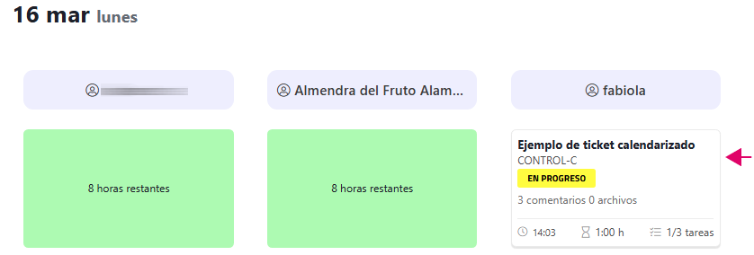 Una vez calendarizado, el ticket aparece en el "Calendario de Tickets", organizado por: