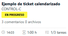 La tarjeta de ticket calendarizado representa visualmente un ticket dentro del calendario de trabajo. Muestra de forma resumida la información más relevante, permitiendo identificar rápidamente su estado, tiempo asignado y progreso sin necesidad de acceder al detalle del ticket.