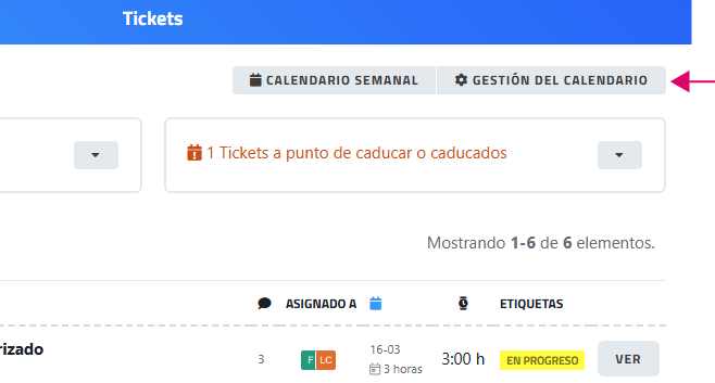 Tras hacer clic en “Gestión del calendario”, se accede a la vista de Calendario de Tickets.
