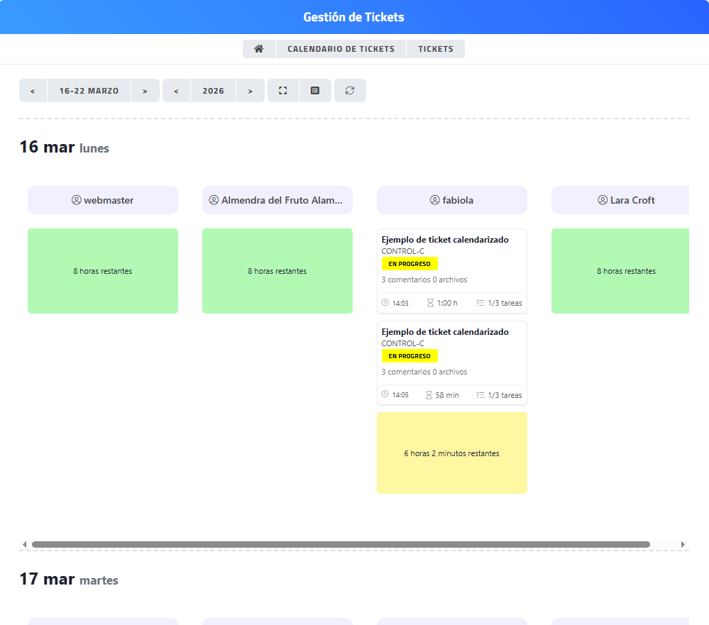 Una vez calendarizado, el ticket aparece en el Calendario de Tickets, organizado por: