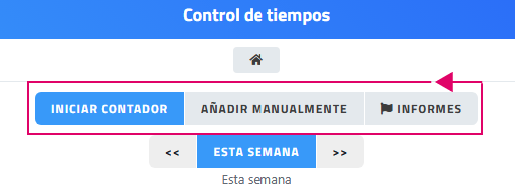 Esta sección del "Control de tiempos" permite acceder a las principales acciones relacionadas con el registro y gestión del tiempo. Desde aquí, el usuario puede iniciar un contador para registrar tiempo en tiempo real, añadir registros de forma manual o consultar informes asociados.