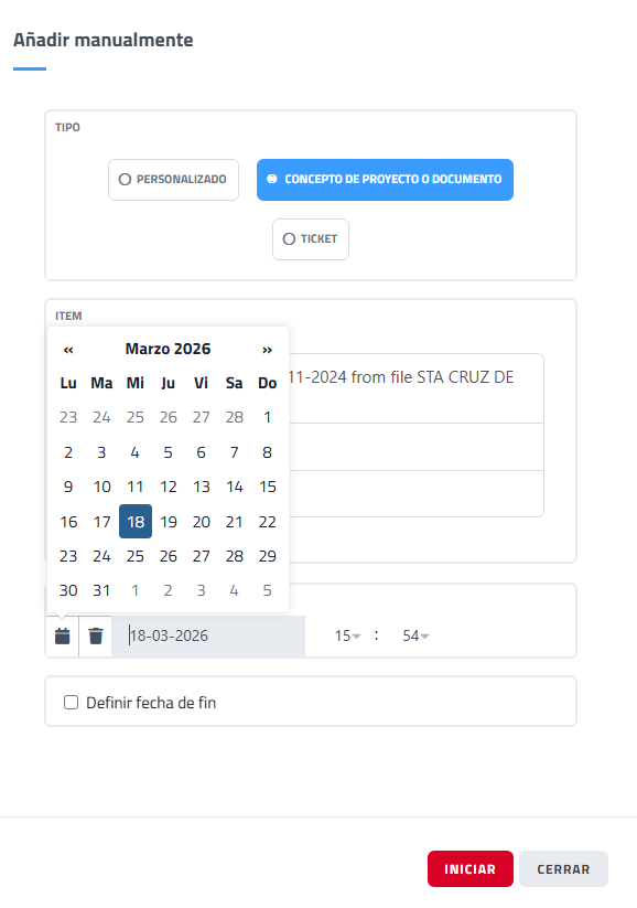 El usuario puede seleccionar el tipo de registro, indicar el ítem correspondiente, definir la fecha y hora, y opcionalmente establecer una fecha de finalización. Esta opción es útil cuando el tiempo trabajado no ha sido registrado en tiempo real o requiere imputación posterior.