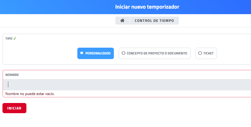 La interfaz “Iniciar nuevo temporizador” permite comenzar el registro de tiempo asociado a una actividad concreta. El usuario puede seleccionar el tipo de registro (personalizado, proyecto/documento o ticket) y elegir el elemento sobre el que se imputará el tiempo. Esta funcionalidad facilita el seguimiento preciso del tiempo dedicado a cada tarea.