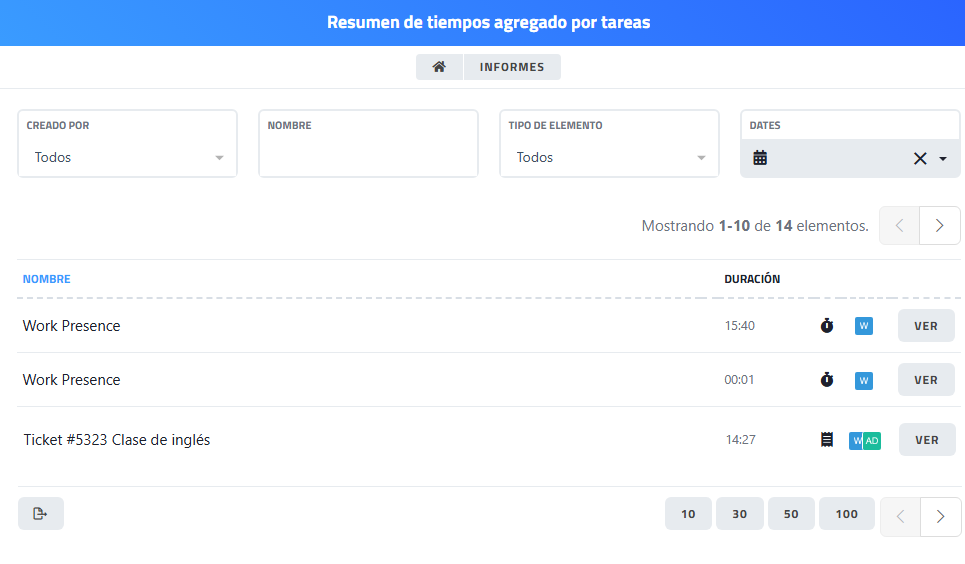 Incluye herramientas de filtrado para acotar la información mostrada (por usuario, nombre, tipo de elemento y rango de fechas), así como un listado con la duración total registrada por cada elemento. Desde esta vista, el usuario puede acceder al detalle de cada registro o analizar el tiempo imputado.
