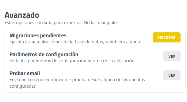 No manipular. Incluye configuraciones técnicas del sistema destinadas a usuarios con conocimientos avanzados, como parámetros internos o integraciones.