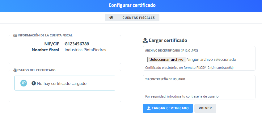 La pantalla Configurar certificado permite cargar y gestionar el certificado digital asociado a una cuenta fiscal. Este certificado es necesario para la firma de facturas electrónicas y otras operaciones que requieren validación digital. La interfaz muestra el estado actual del certificado y permite subir un archivo seguro junto con la contraseña del usuario.