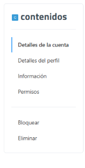 En el menú lateral izquierdo titulado "Contenidos" se encuentran los accesos a las diferentes páginas de configuración y acciones disponibles sobre la cuenta de usuario