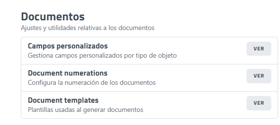 Desde esta sección se gestionan distintas opciones relacionadas con la personalización y configuración de los documentos, como la definición de campos personalizados, la numeración y las plantillas utilizadas en su generación. Dispone de tres secciones.