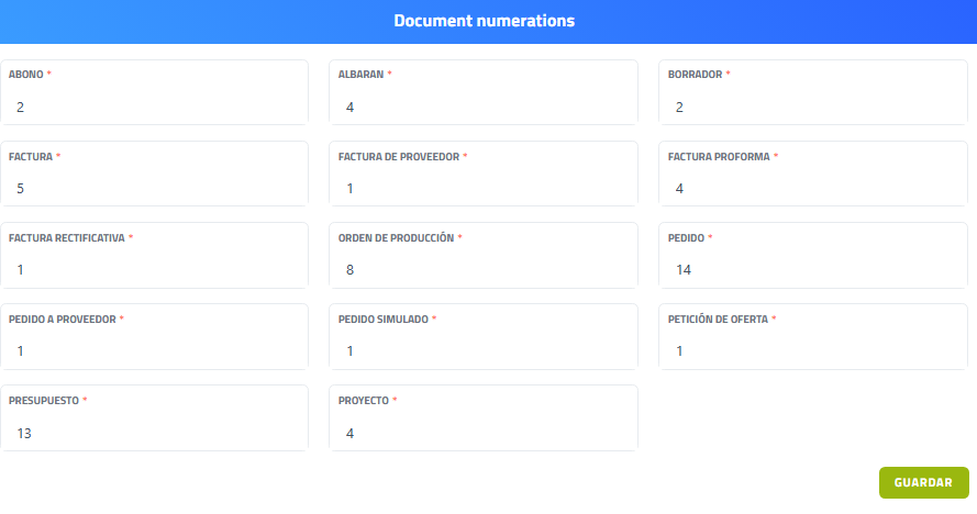 Al hacer clic en el botón Botón “Ver” se accede a la sección en la que se configura la numeración automática de los documentos.