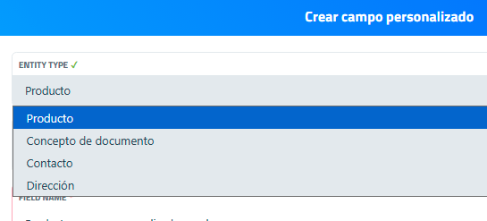 Permite seleccionar el tipo de entidad u objeto al que se asociará el campo (por ejemplo, producto).