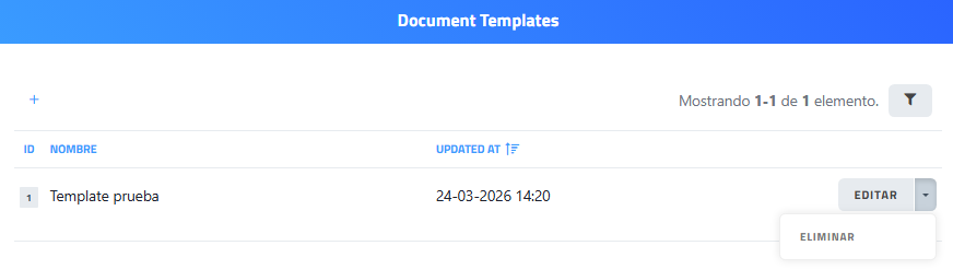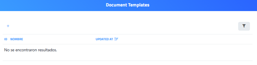 La página corresponde a la sección “Document Templates" (Plantillas documentos), es en donde se gestionan las plantillas utilizadas para la generación de documentos en el sistema. Desde esta vista se pueden visualizar las plantillas existentes, filtrarlas y crear nuevas. Actualmente, no hay plantillas registradas, por lo que el listado aparece vacío.