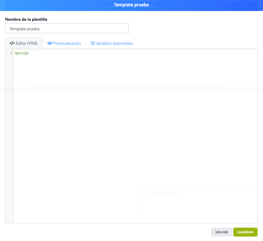 - Botón "VOLVER" para salir de la edición de template sin guardar cambios.