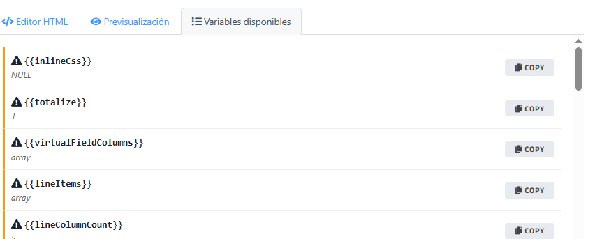 - Variables disponibles para añadir datos dinámicos a la plantilla.