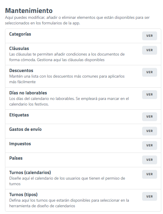La sección correspondiente al módulo de “Mantenimiento”, es donde se gestionan distintos elementos configurables del sistema que pueden ser utilizados en formularios y procesos de la aplicación. Desde esta sección se pueden crear, modificar o eliminar categorías, cláusulas, descuentos, impuestos y otros parámetros auxiliares que facilitan la gestión operativa.
