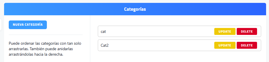 | Mensaje informativo | Indica que las categorías pueden ordenarse y anidarse mediante arrastre. |