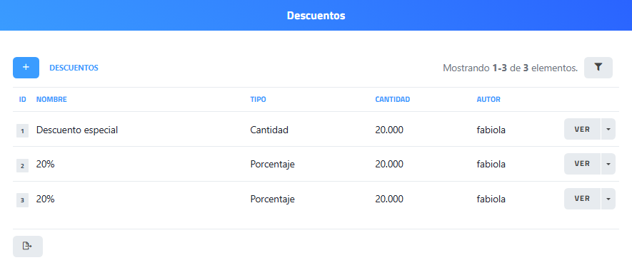 Al hacer clic lleva a la página “Descuentos”. Esta subsección correspondiente al módulo de “Mantenimiento” permite gestionar los descuentos predefinidos del sistema, que pueden aplicarse fácilmente en documentos. Desde esta pantalla se pueden crear, visualizar y gestionar descuentos, definiendo su tipo (cantidad o porcentaje), valor y autor.