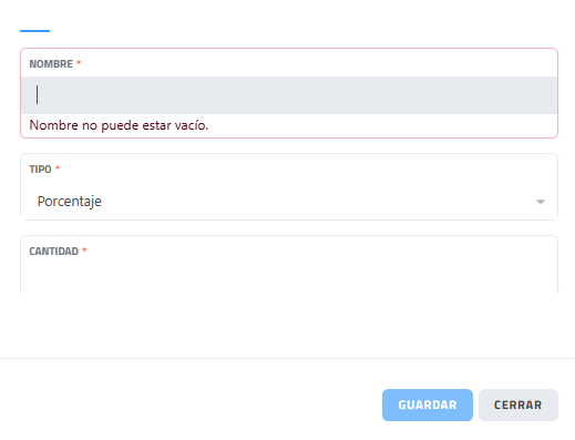 En esta sección se permite crear o editar un descuento dentro del sistema, definiendo su nombre, el tipo de valor aplicado (porcentaje u otro) y la cantidad correspondiente.
