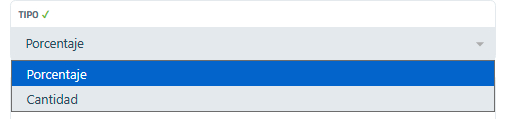 Desplegable para seleccionar entre dos tipos de valor para el descuento: