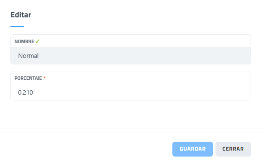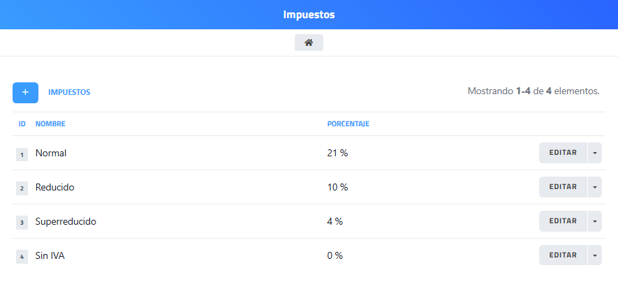 En esta subsección se visualizan y gestionan los tipos impositivos aplicables en el sistema, permitiendo consultar y modificar los porcentajes asociados a cada tipo de impuesto.