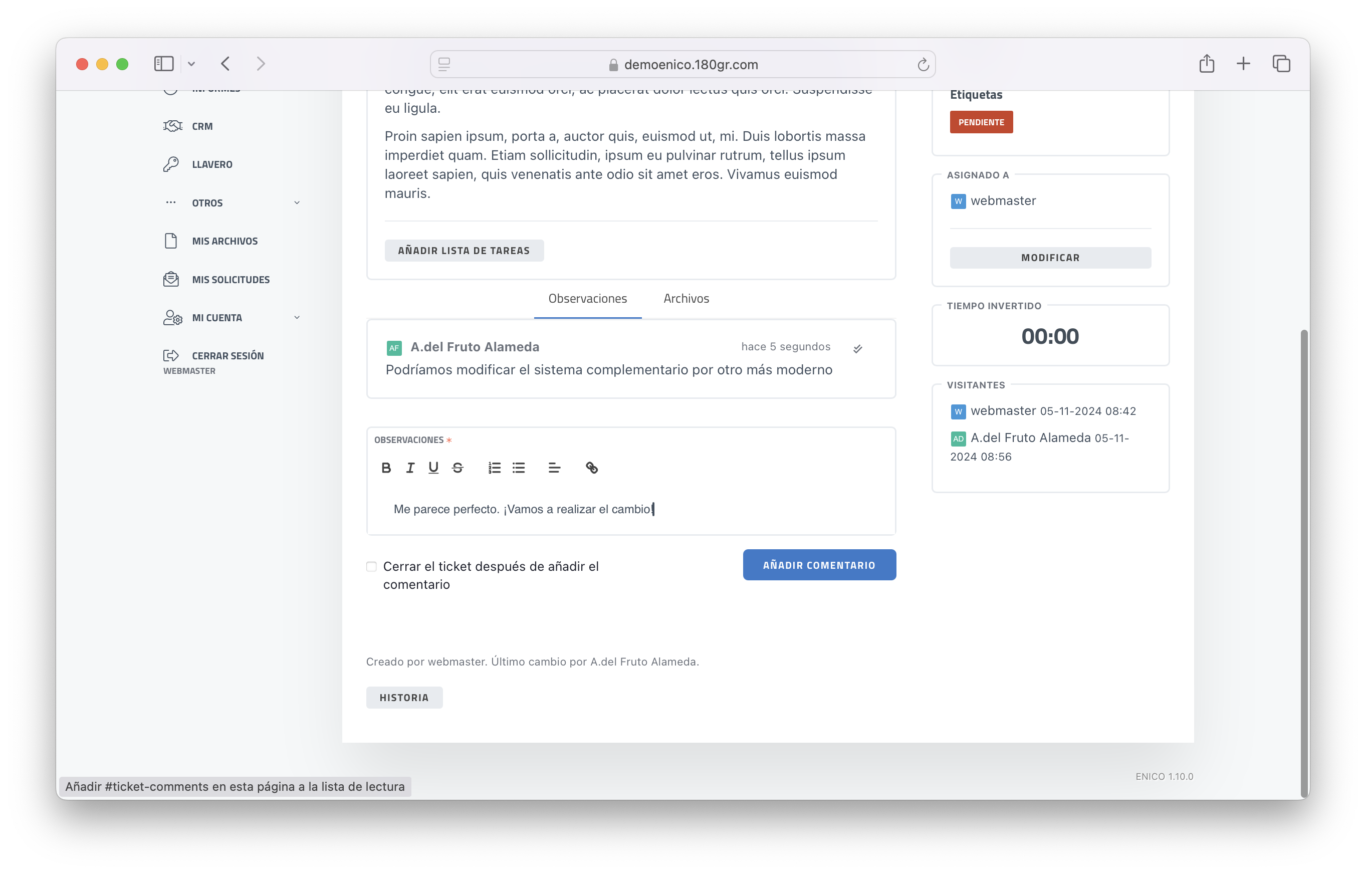 Casilla opcional para cerrar el ticket al añadir el comentario