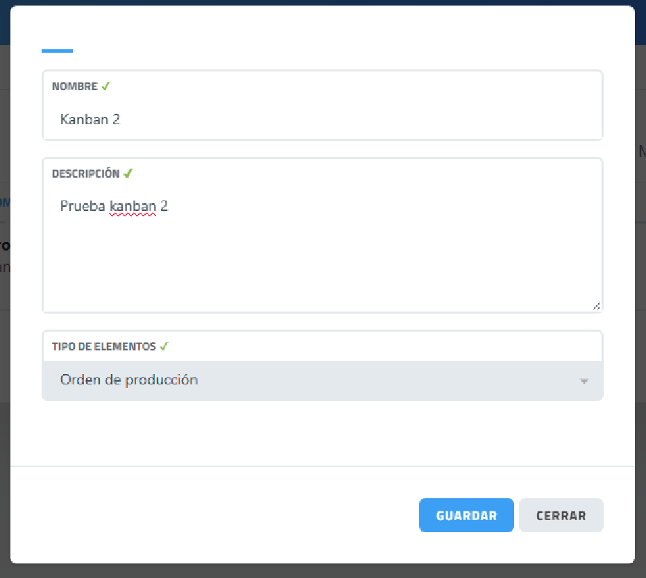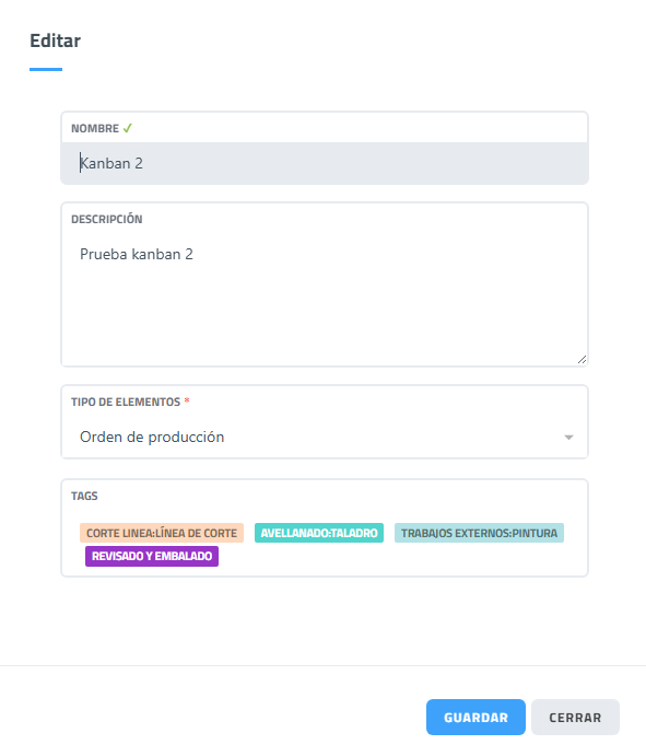 Permite crear, consultar y eliminar etiquetas para las fases de producción. Las etiquetas de producción son consideradas por el sistema como fases de producción. Esto ayuda a organizar mejor la información al poder usar Kanban para el control y supervisión de los procesos productivos.
