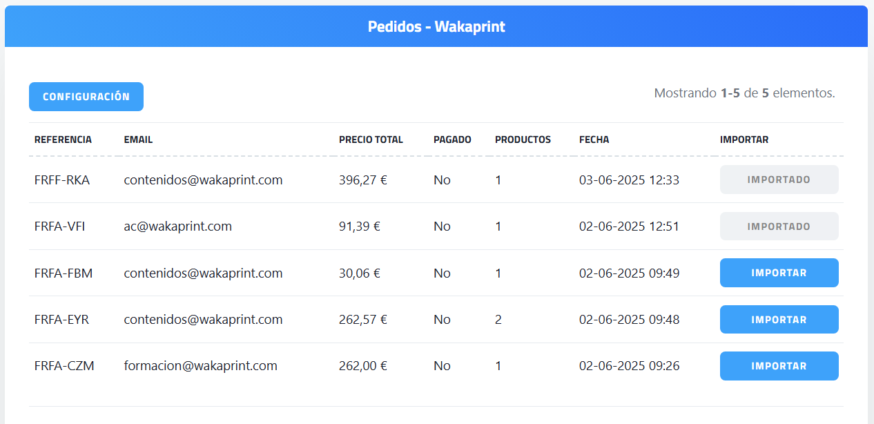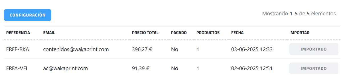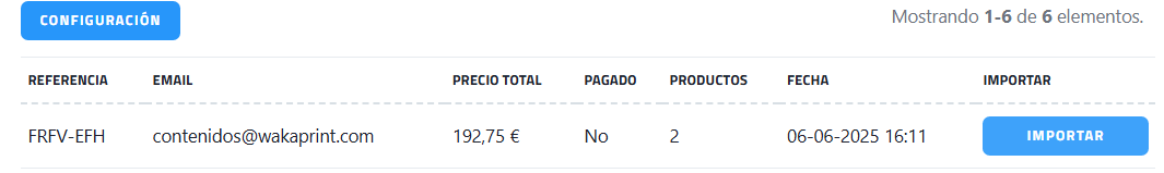 Referencia Código único de identificación del pedido (ej. FRFF-RKA).Email Correo del usuario o cliente que realizó el pedido. Precio Total Monto total del pedido, expresado en euros. Pagado Indica si el pedido ha sido pagado ( SíoNo).Productos Número de productos incluidos en el pedido. Fecha Fecha y hora en que se realizó el pedido. Importar Botón que permite importar el pedido al sistema (activo o desactivado). - Botón Importar. Tiene dos estados posibles: