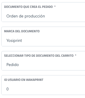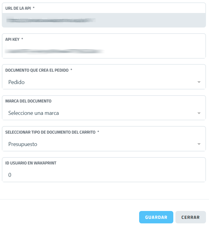 Configuración. Esta pantalla permite establecer los parámetros necesarios para conectar y operar correctamente con la API de Wakaprint desde el ERP. Se divide en campos de configuración obligatorios y opcionales.