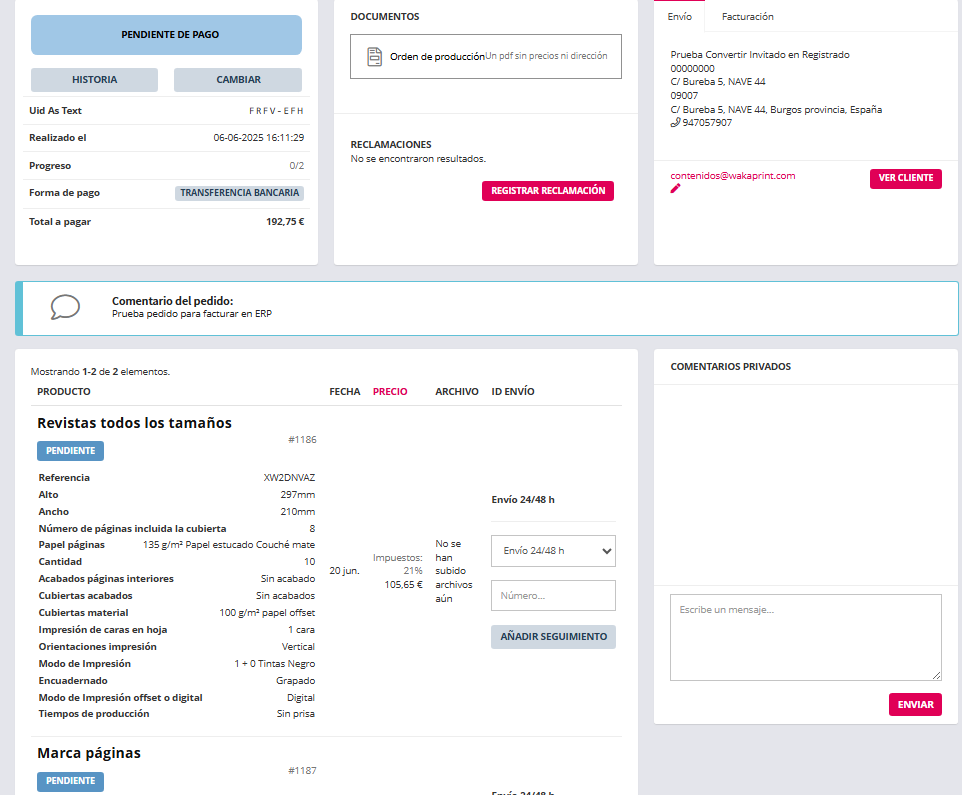 Vista del pedido en la lista de pedidos del módulo Wakaprint del ERP