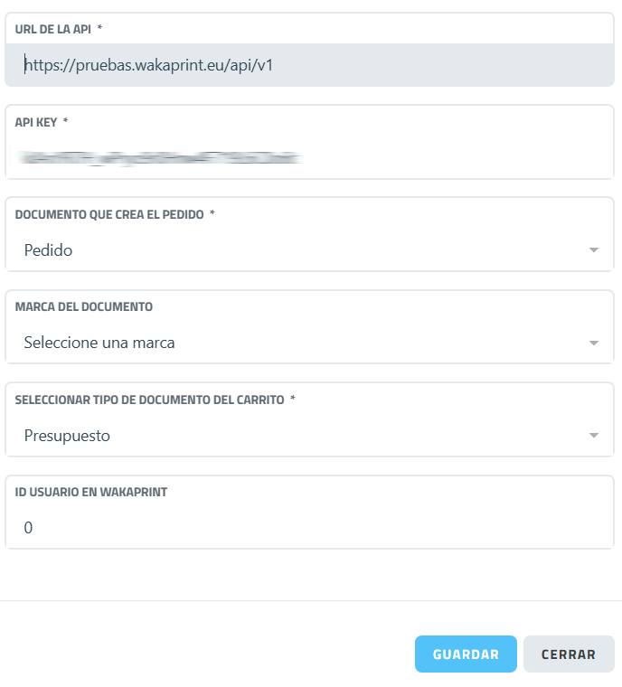 URL DE LA API (obligatorio) Dirección del servidor de Wakaprint al que se conectará el ERP. En entornos de pruebas, suele usarse una URL como: https://pruebas.wakaprint.eu/api/v1.