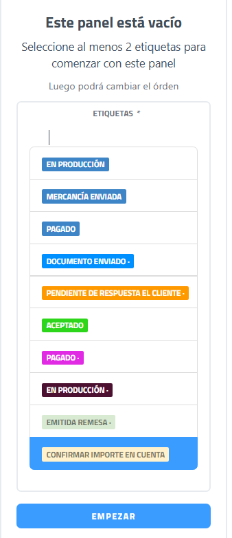 Una vez seleccionadas un mínimo de dos, hacer clic en empezar para que se creen las columnas en el Kanban.