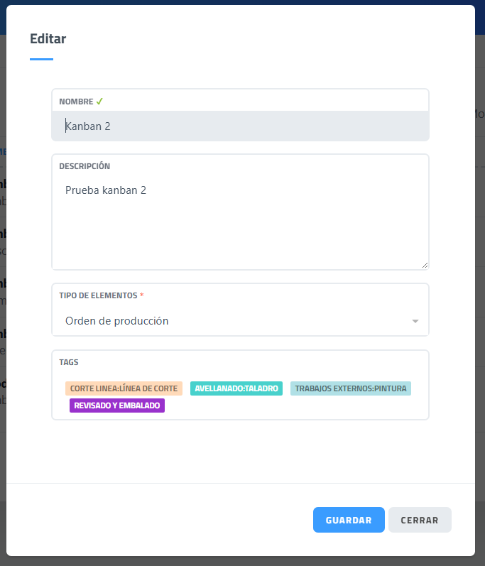 El resto de funcionamiento es igual que el de tipos de Kanban teniendo en cuenta que en este tipo de Kanbans únicamente son para operar con ordenes de producción y las etiquetas para las columnas serán las creadas para uso del módulo de producción.