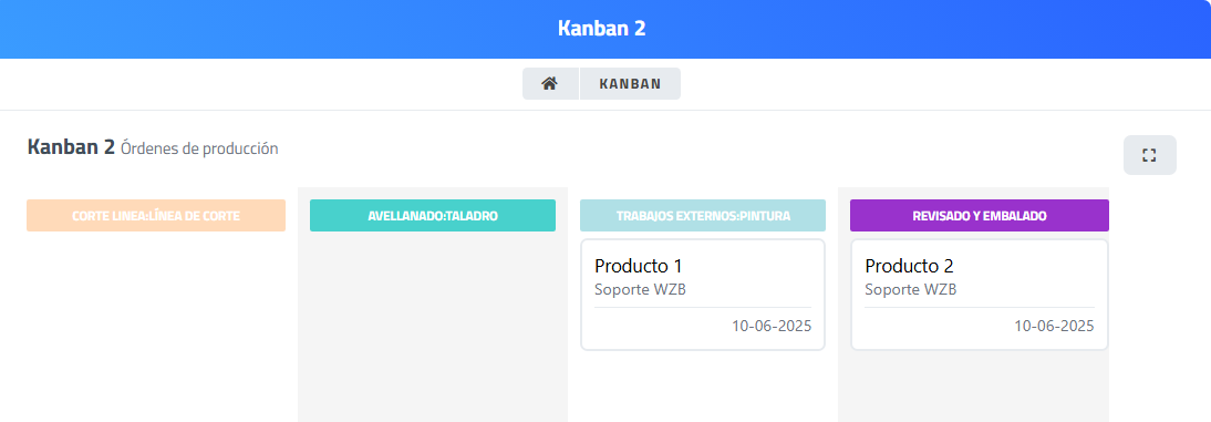 Dentro del módulo CMS, se pueden crear tableros Kanban orientados al seguimiento y control de las órdenes de producción. Esta funcionalidad permite gestionar visualmente el avance de cada orden a través de las distintas etapas del proceso productivo, optimizando la supervisión y la toma de decisiones operativas.