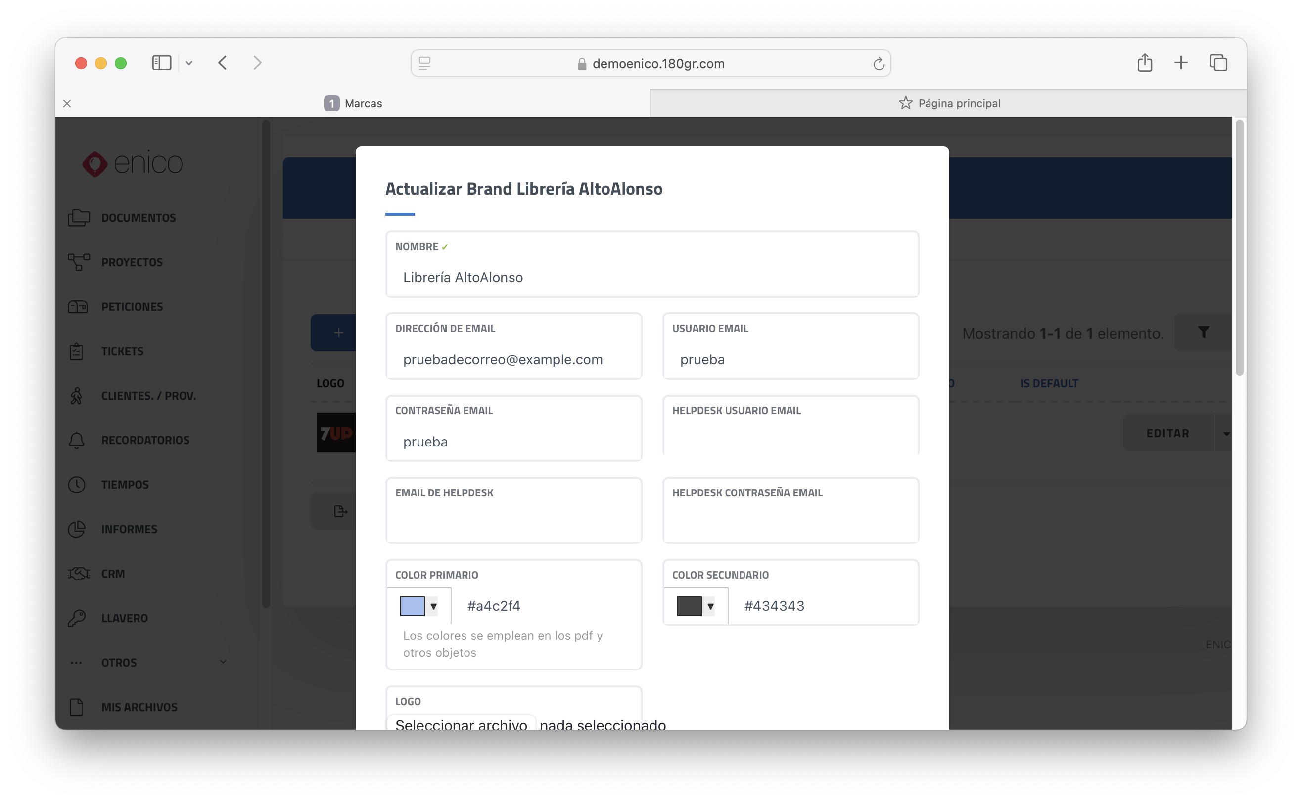 En el siguiente paso, veremos en detalle el formulario de configuración para definir estos datos y asegurar que la identidad y comunicaciones de cada marca estén correctamente configuradas en ENICO.