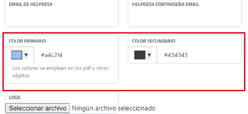 •Color primario y Color secundario: Estos colores se aplican en los documentos generados (por ejemplo, en los PDF), ayudando a mantener la identidad visual de la marca.